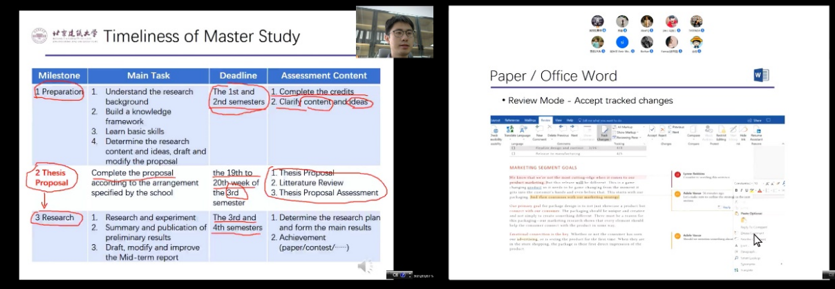 3月7日的线上讲座中,綦绩面向“一带一路”全英文授课硕士项目学生梳理了培养及毕业流程;介绍了学位论文的开题、中期、答辩的主要内容、所需材料、具体环节和时间节点;分享了论文选题、论文结构、摘要撰写、修订校对、案例研究等知识;培训了Office套件在论文编辑、学术汇报等场景下的操作指南与使用技巧。