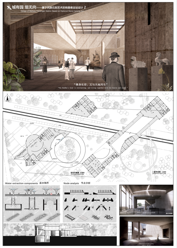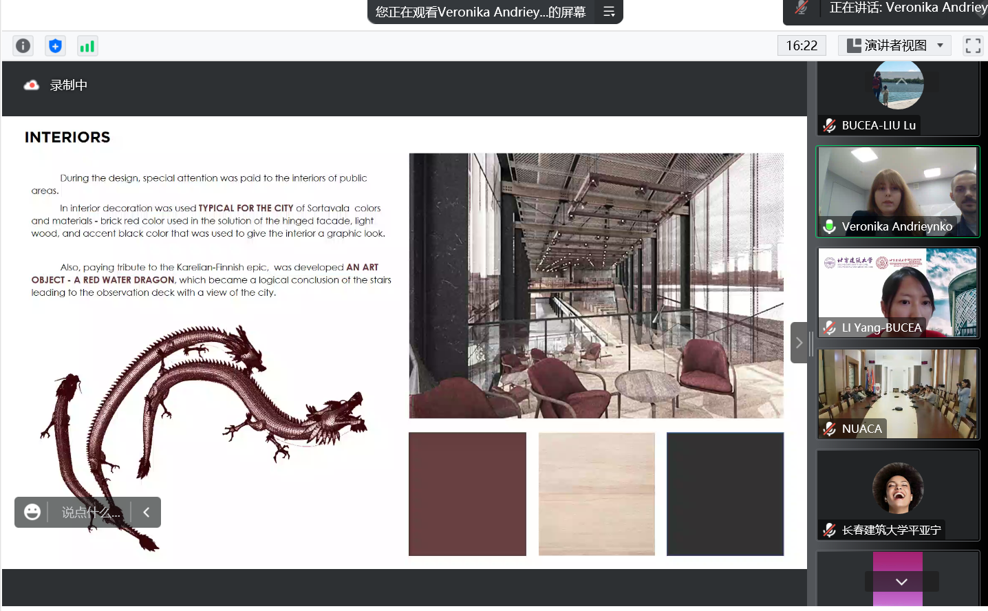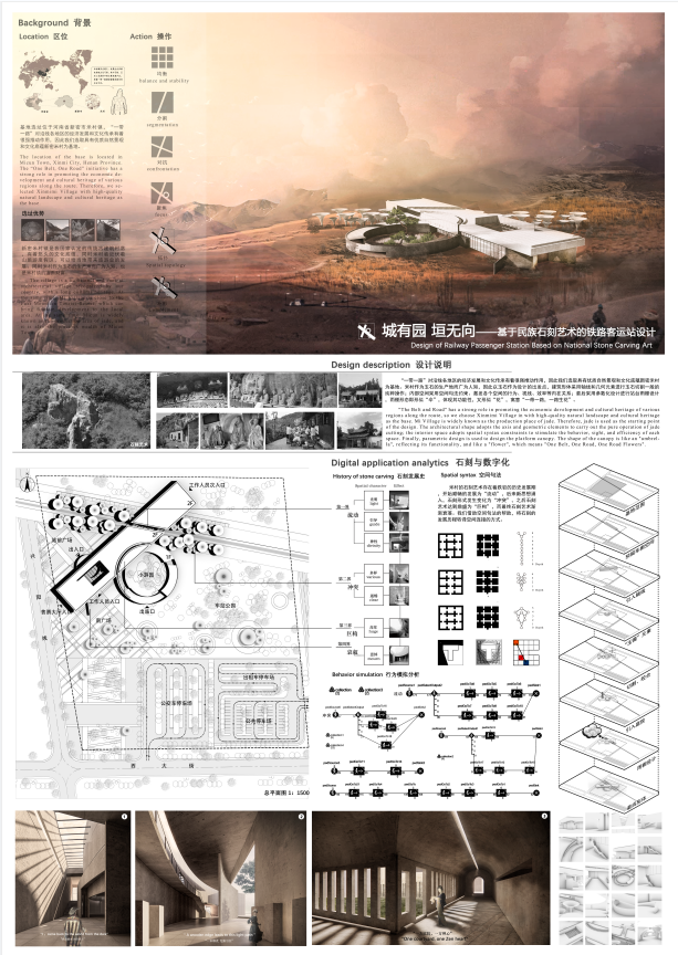 在数字化建筑设计方向,来自俄罗斯圣彼得堡国立建筑大学的Veronika Andriyenko介绍了作品“设有客运枢纽站的索尔塔瓦拉多功能社区中心”。Veronika根据索尔塔瓦拉的城市特色——三角形广场,为被铁路分隔形成的包含市中心、路堤和公园的综合区域,设计并实现交通、休闲和工作三种功能。郑州大学的袁亮、陈云祥、刘吉龙、郭亚婷和黄蕊分享了“城有园 垣无向——基于民族石刻艺术的铁路客运站设计”的设计理念,特别是站台雨棚采用参数化设计,雨棚形态即形似“伞”,体现其功能性,又形似“花”,寓意“一带一路,一路生花”。