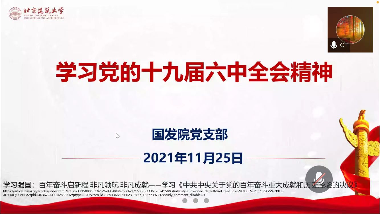 11月25日下午,国发院党支部组织全体党员集中学习党的十九届六中全会精神和党章党规。支部书记陈韬同志主持会议。