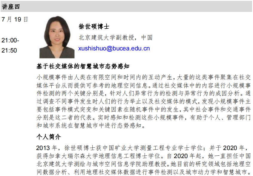 (BUCEA)和国际摄影测量与遥感学会学生联盟(ISPRS SC)联合举办,旨在为来自不同国家和地区的学生和青年学者提供一个学术和文化的国际交流平台。届时,本项目将邀请来自ISPRS和国内外专家学者就智慧城市的建设、管理,以及城市规划的可持续发展做高水平讲座,介绍构建智慧城市的创新方法、实践技术、成功案例。除常规课程外,暑校还将安排举办文化实践活动,介绍ISPRS学生联盟和色情短剧