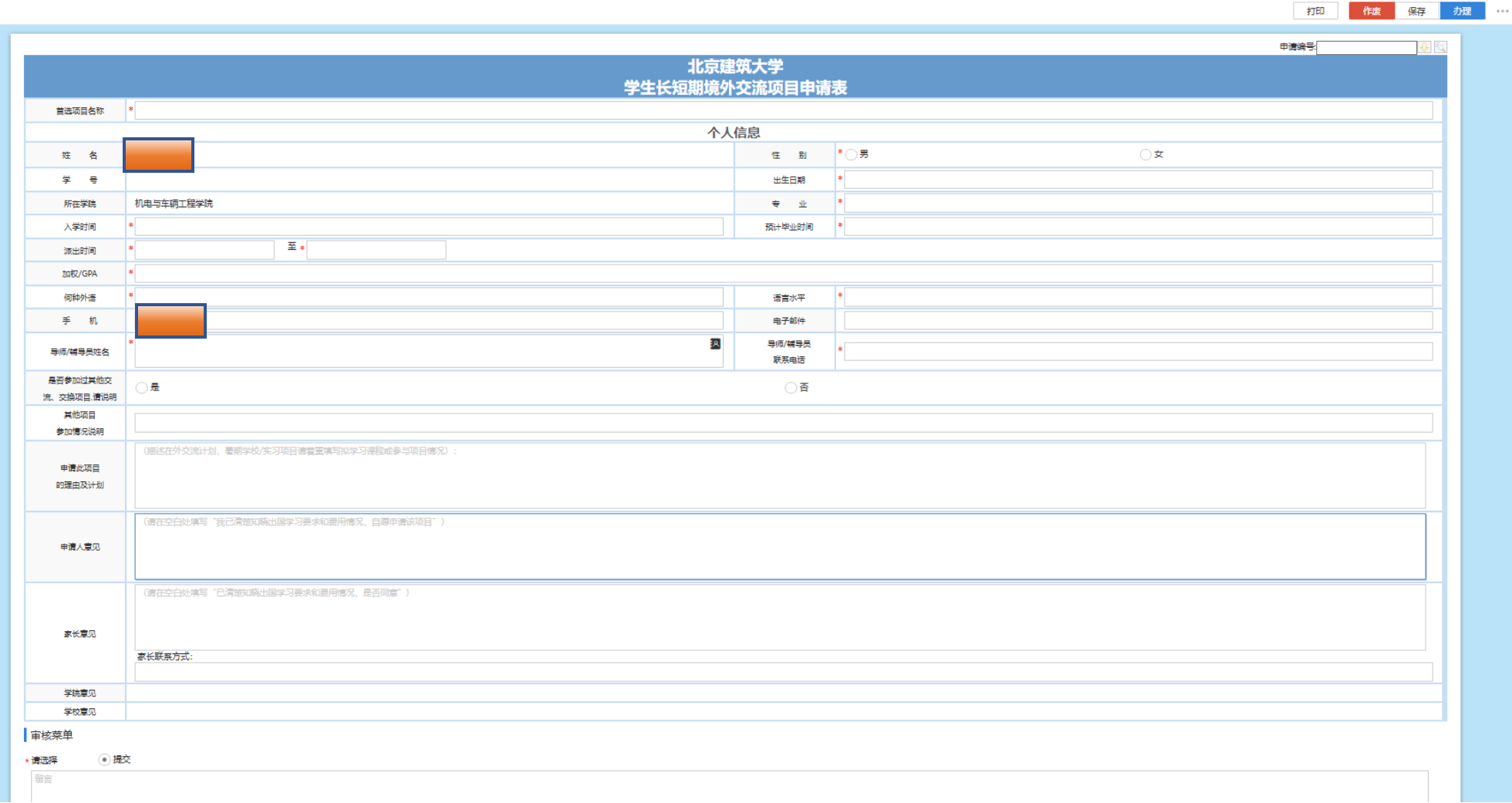 学生长短期境外交流项目申请表”,记得所有的信息要填全,不要有漏项。务必记得全部填写完毕后点击右上角“办理”。后续同学们可以在“跟踪”里查看申请的审批进度。