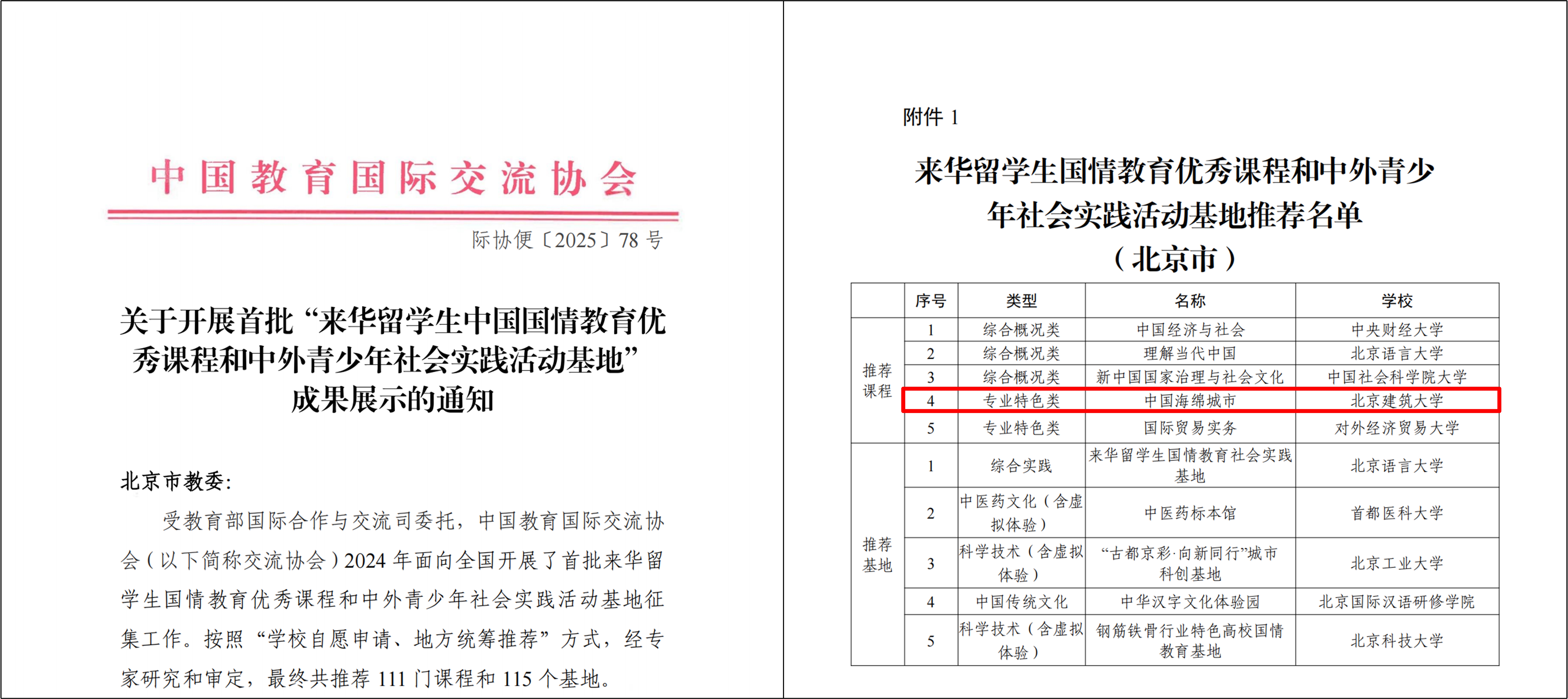 Last year, the Chinese-context education program "China Sponge City" offered by Beijing University of Civil Engineering and Architecture was successfully selected into the list of the first batch of 111 excellent Chinese-context education programs for international students in China, which was jointly selected by the Department of International Cooperation and Exchanges of the Ministry of Education and the China Education Association for International Exchange. It is one of the five excellent Chinese-context education programs for international students in Beijing.