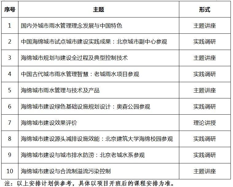 项目拟在今年5-10月以集中培训营的形式进行(拟在周末及暑期开展),以中文授课为主,招收15-20名来华留学生。《中国海绵城市发展历程》《海绵城市规划建设》两个方向融合开展,涵盖10个主题,共32学时。