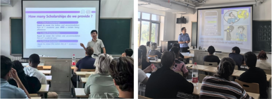 学校特邀北京市公安局出入境管理局西城分局高玮警官来校举办法律法规专题讲座,为新生讲解在华居留、学习的相关法律知识,包括中国的重要法律法规、签证居留许可政策、网络安全注意事项等,帮助国际学生筑牢遵法守法意识。
