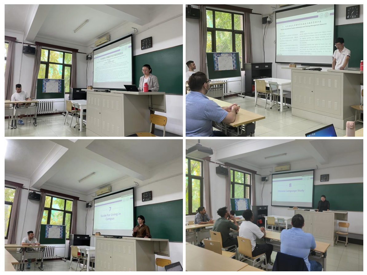 国际学生学位授予工作实施细则》等学籍和学位管理文件。国际学生辅导员金伯就国际学生招生与培养、奖学金等方面的重要规范性文件进行了讲解;围绕国际学生应遵守的中国法律法规,详细介绍了国际学生证件管理须知及日常生活注意事项;同时针对国际学生在京住宿、购物和交通出行等方面做了安全提示。蒋春玲老师讲解了学校公寓管理规定、学费和住宿费缴纳以及保险购买要求等校园生活须知,并详细介绍校园无线网络、两校区班车等情况。唐皓老师就国际学生汉语学习相关的HSK考试、校内学习资源等进行了介绍,并鼓励学生们努力学好汉语,在实际生活中多说、多练。会上,来自巴基斯坦等国家的2021级国际学生新生就其关心的教学安排、奖学金等问题与各位老师提问交流。