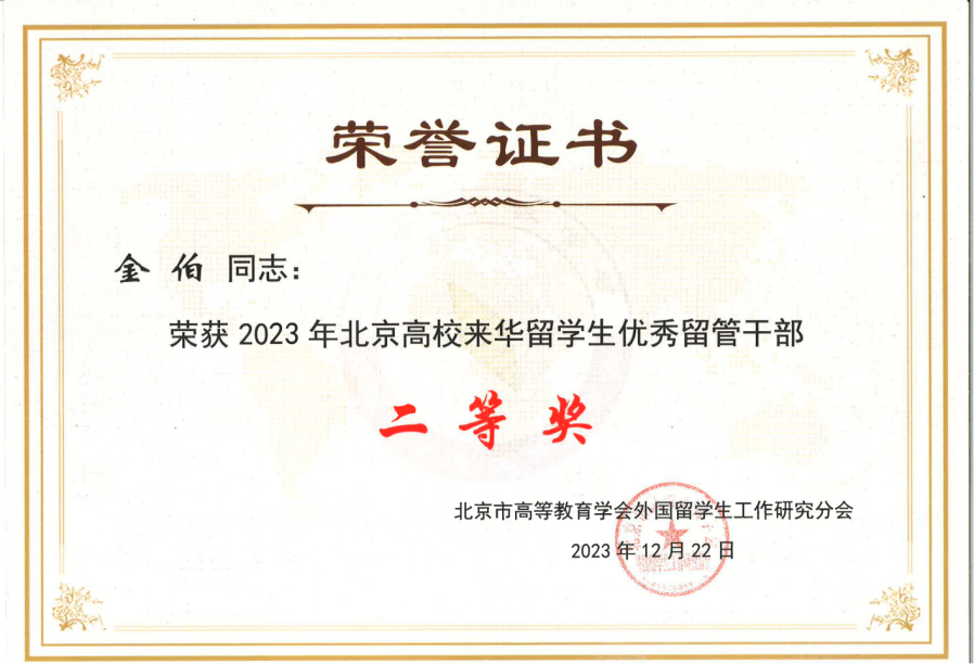 国际学生辅导员金伯荣获北京高校来华留学生优秀留管干部二等奖。