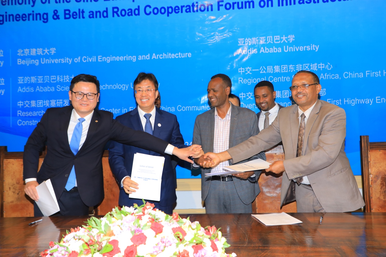 党委书记郑宇、亚的斯亚贝巴大学代理校长马蒂沃斯·恩瑟姆、亚的斯亚贝巴科技大学校长德雷杰·恩吉达、中交一公局集团东非区域中心总经理韦强余共同签署基地建设合作意向书,并代表四方致辞。