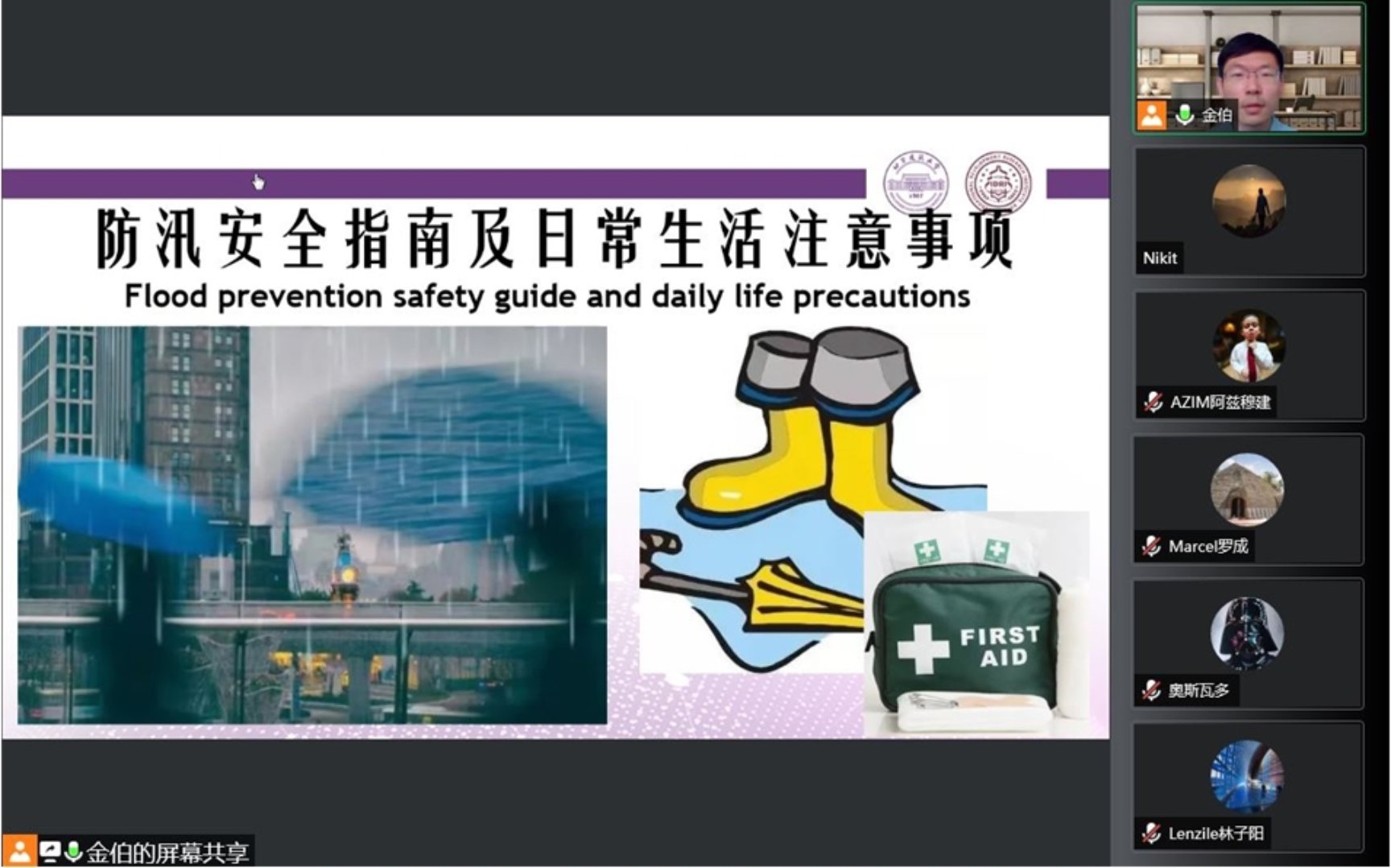 6月9日,国发院组织境内全体国际学生召开线上防汛安全培训会。国际学生辅导员金伯以《防汛安全指南及日常生活注意事项》为题向国际学生进行了一场生动翔实的防汛安全培训。