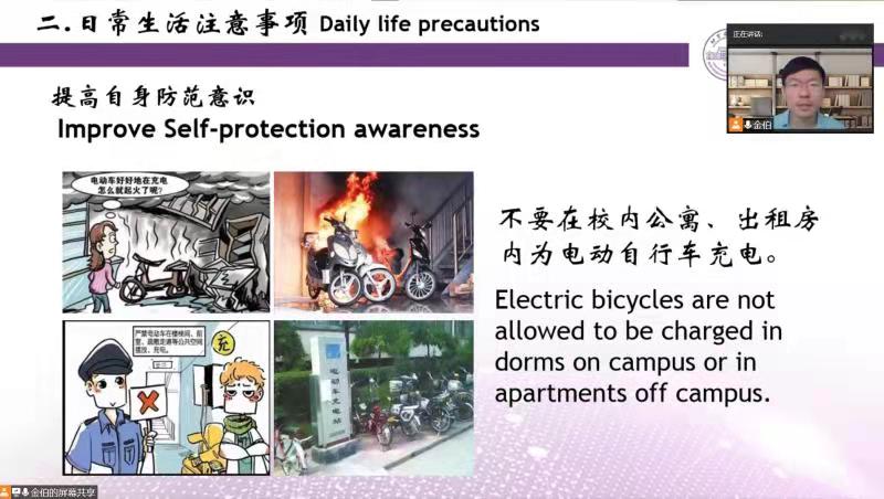 讲座内容分为防汛抗洪知识、日常法律法规、生活注意事项三部分。防汛抗洪知识旨在帮助学生了解汛期形势、汛期安全指南和注意事项;日常法律法规包括对近期签证办理、住宿登记、宗教活动相关法律法的宣传讲解;生活注意事项旨在提醒国际学生用火用电规范、提高交通安全意识等。最后金伯就学生关心的防疫问题进行了解答。