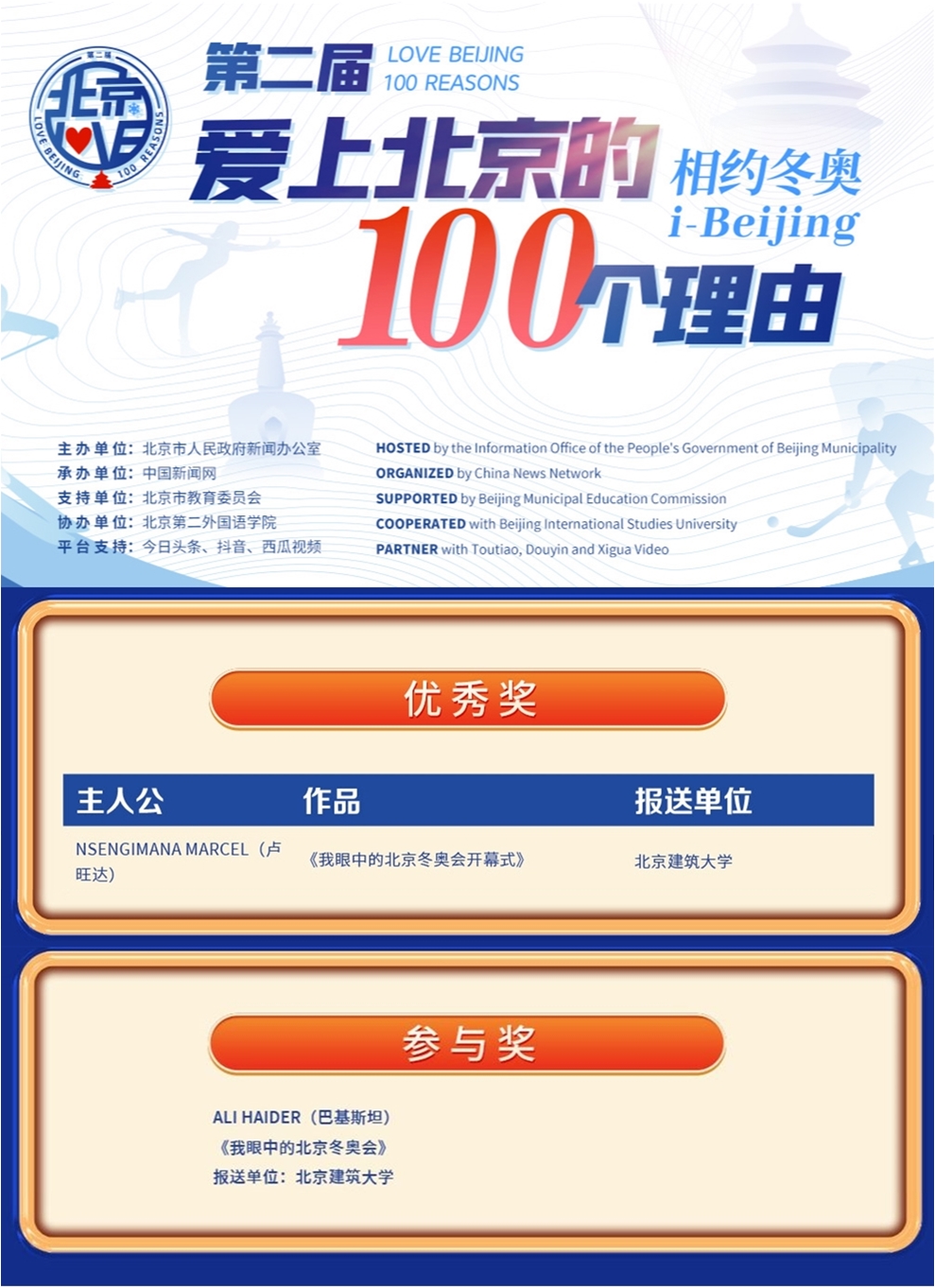 卢旺达籍国际学生罗成的短视频作品《我眼中的北京冬奥会开幕式》、巴基斯坦籍国际学生哈迪的短视频作品《我眼中的北京冬奥会》分获优秀奖和参与奖。金伯、黄兴两位老师获评优秀指导教师。