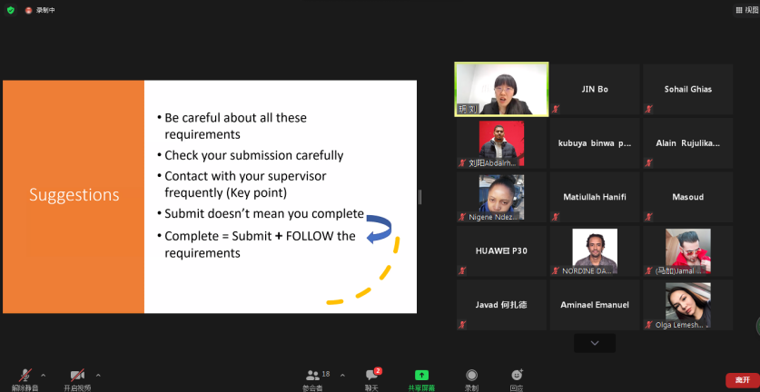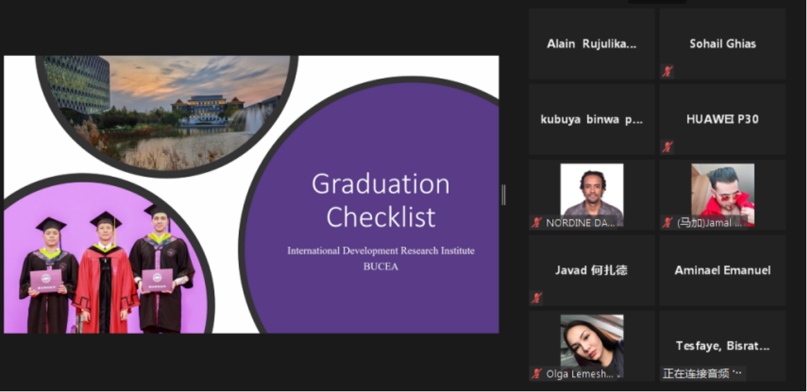 “一带一路”全英文授课硕士研究生项目2018级、2019级国际学生毕业工作会,介绍不同学习阶段学生的完整毕业流程及要求,传达应届毕业生相关工作。