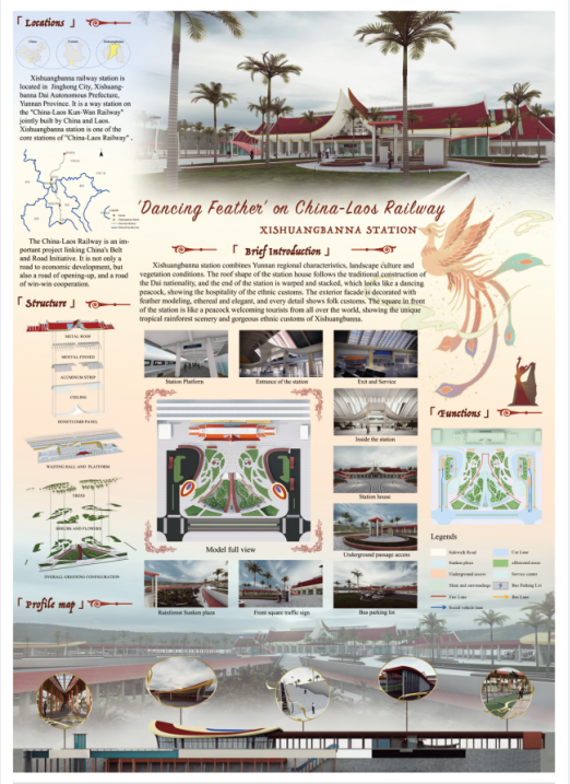 的付泽昕、梁轩硕、付思源、金璐和黄圣佳综合考虑了“一带一路”国家战略、地域及数据源等因素,以云南省的西双版纳火车站为地理场景建模区域,形成了三维实体建模作品“中老铁路上的‘雀舞之翎’”。俄罗斯莫斯科理工大学梁赞分校的Zharinov Alexey Sergeevich根据多条运输路线途径俄罗斯的现实因素,特别是新丝绸之路纵向走廊和印度到圣彼得堡的南北经向走廊,在作品中主张在梁赞建立交通运输中转枢纽,形成强大的铁路客运综合体,连接梁赞与所有城市区域。