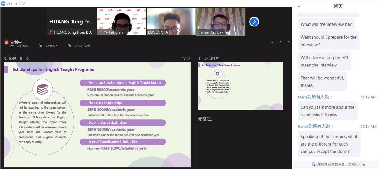 概况、来华留学相关政策、全英文授课和中文授课项目、学科专业情况等,并就学生关心的专业选择、学费及奖学金政策、语言要求等问题回答了同学们的提问。截止展会结束,通过线上宣讲、视频连线、线上答疑、邮件反馈等方式共接待咨询学生约120人,学生们对色情短剧