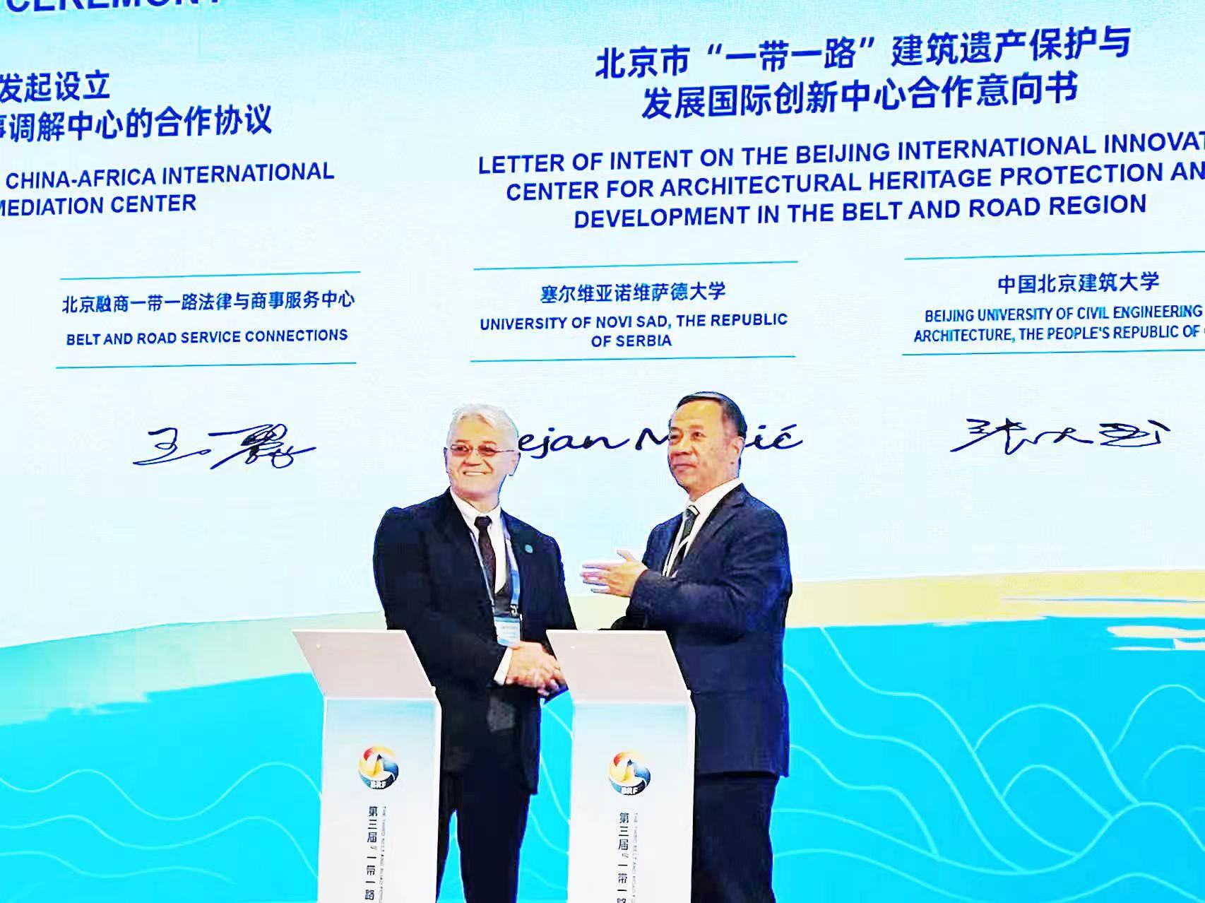 校长张大玉教授与塞尔维亚诺维萨德大学校长德扬·马迪克(Dejan Madić)教授在专题论坛上成功签署“北京市‘一带一路’建筑遗产保护与发展国际创新中心”合作意向书,是第三届“一带一路”国际合作高峰论坛地方合作专题论坛签署的15项中外地方合作协议之一,也是北京市积极酝酿并向大会推荐的5项重点项目之一。该中心全面开启“一带一路”沿线国家和地区的高校、国际学术组织、企业等主体在建筑遗产保护和历史城市可持续发展领域的深度合作。双方一致同意,将汇聚各自在建筑遗产保护、历史城市可持续发展与保护、高水平人才培养等方面的技术与资源优势,形成一批国际领先的建筑遗产与历史城市低碳共生技术相关科研成果,将中心建设成为相关学科领域的国际知名学术平台、人才培养高地和产学研融合发展基地,动首都高水平国际交流和国际人才培养。