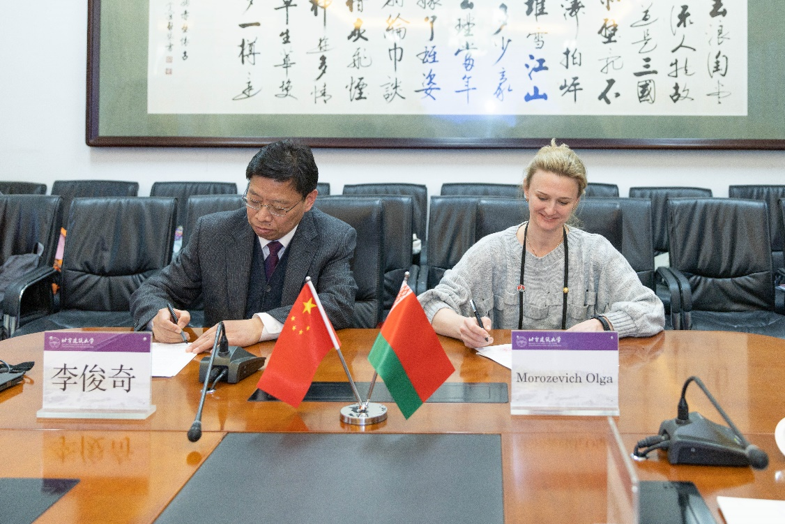 白俄罗斯国立经济大学副校长莫罗泽维奇对北建大为接待代表团所做的精心准备表示感谢,她与李俊奇副校长分别代表学校签署了框架合作协议,就进一步开展务实合作达成共识。双方将在协议框架下加强学科共建、人才培养、文化交流等领域的合作。