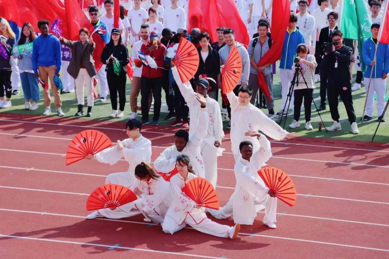 7名国际学生带着对中国传统文化的热爱为全校师生呈现了一场精彩的太极扇表演,赢得了在场观众们的阵阵喝彩。荣获本届运动会风采展示奖。