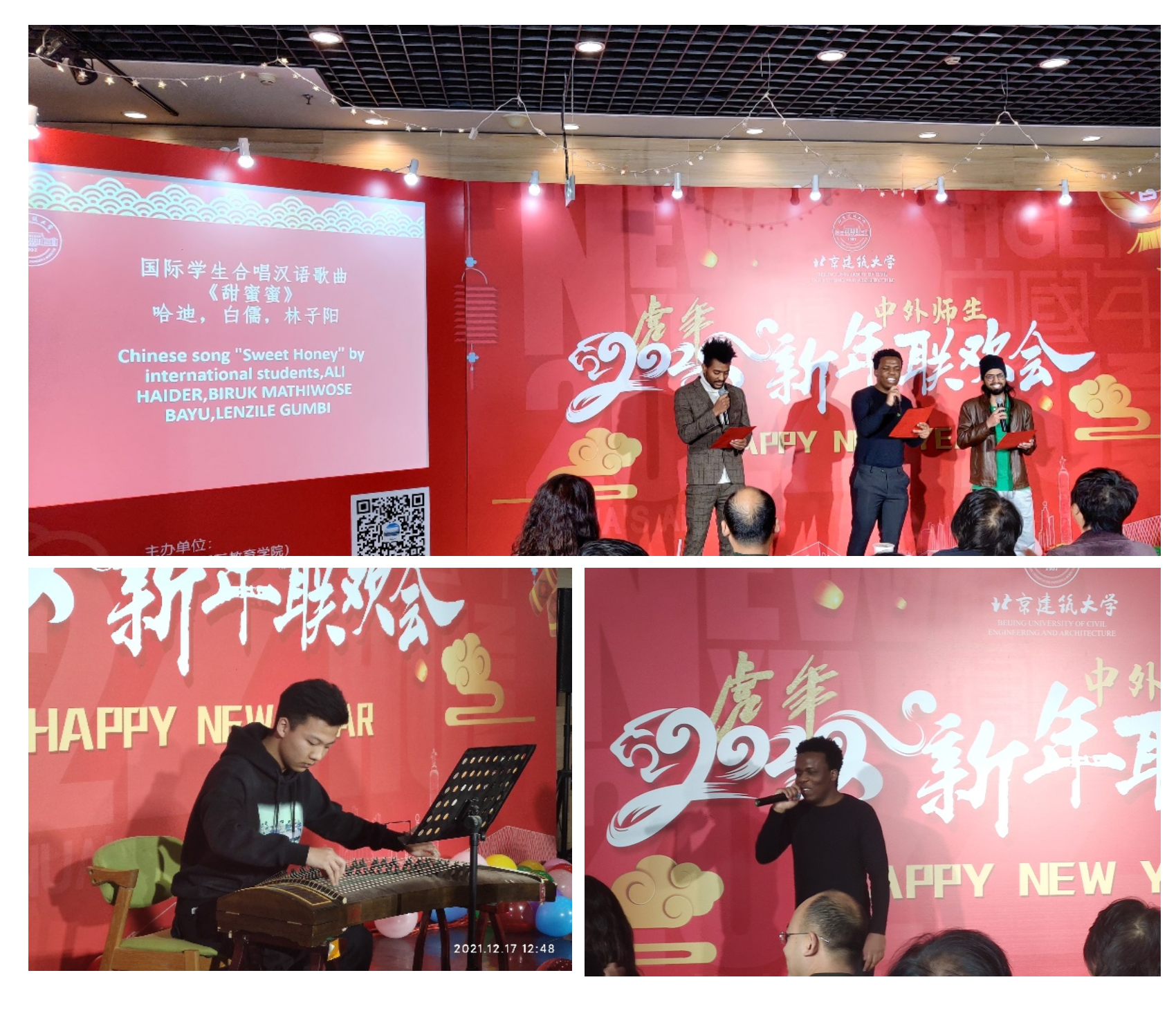 在随后的联欢会上,节目纷呈、精彩不断。大家边欣赏节目,边包饺子,其乐融融。环能学院和国际交流协会的中国学生分别表演了古筝独奏《渔舟唱晚》、《战台风》以及合唱歌曲《一起向未来》;来自巴基斯坦、津巴布韦、埃塞俄比亚的国际学生则带来了优美的中文歌曲《甜蜜蜜》;津巴布韦国际学生林子阳凭借一首英文歌曲《Promises》瞬间引爆全场!精心准备的游戏和抽奖环节穿插其中,活动现场一片欢声笑语。